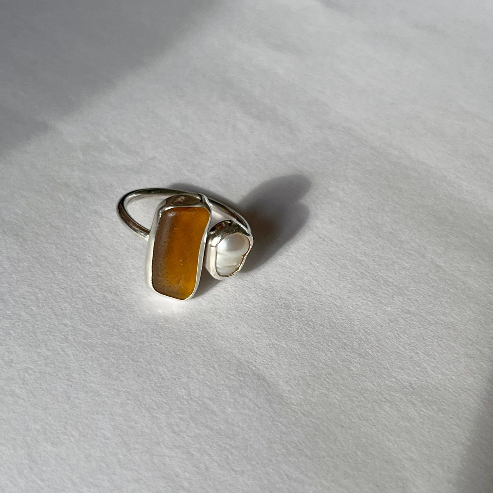 Features a freshwater pearl & handpicked sea glass bezel set on a round band
