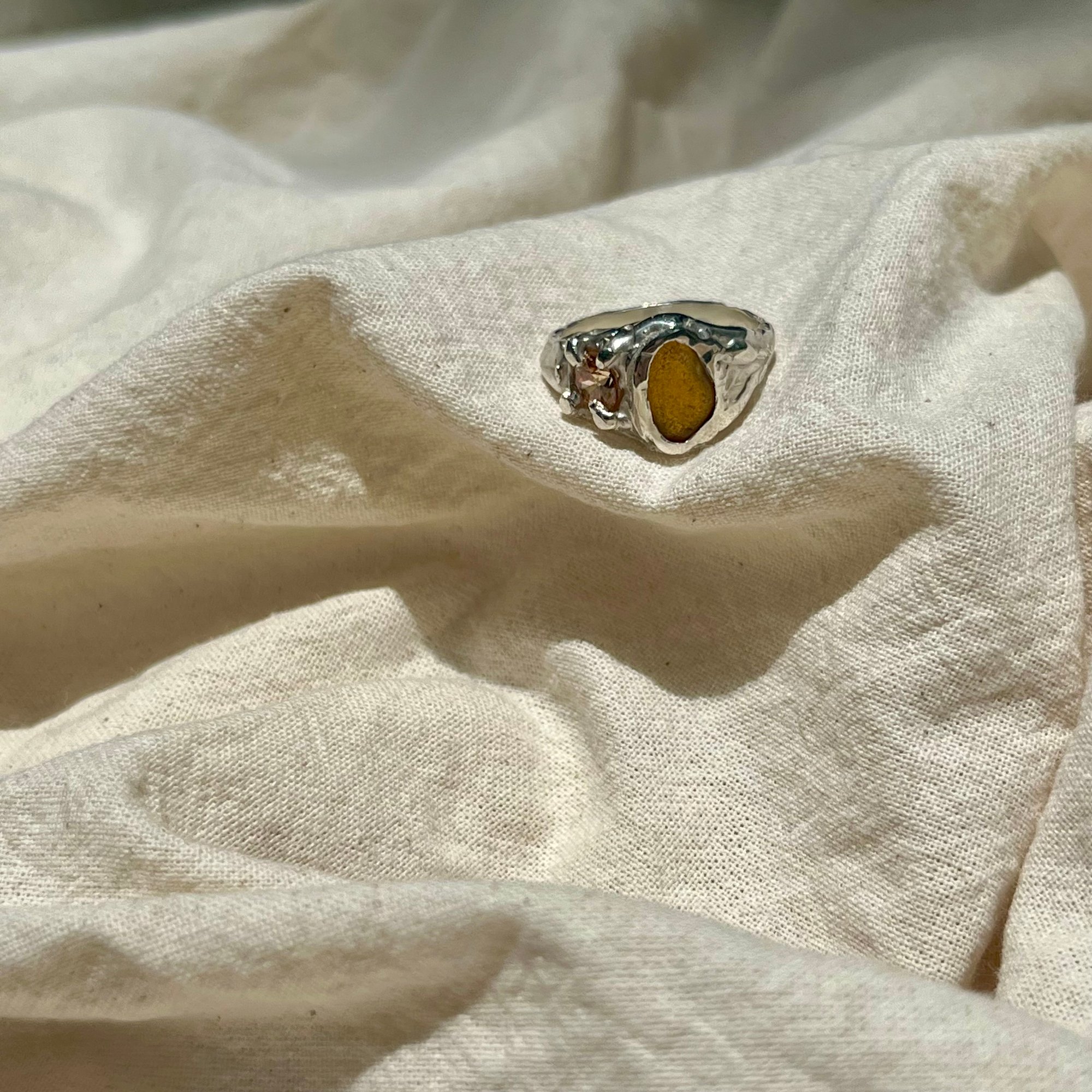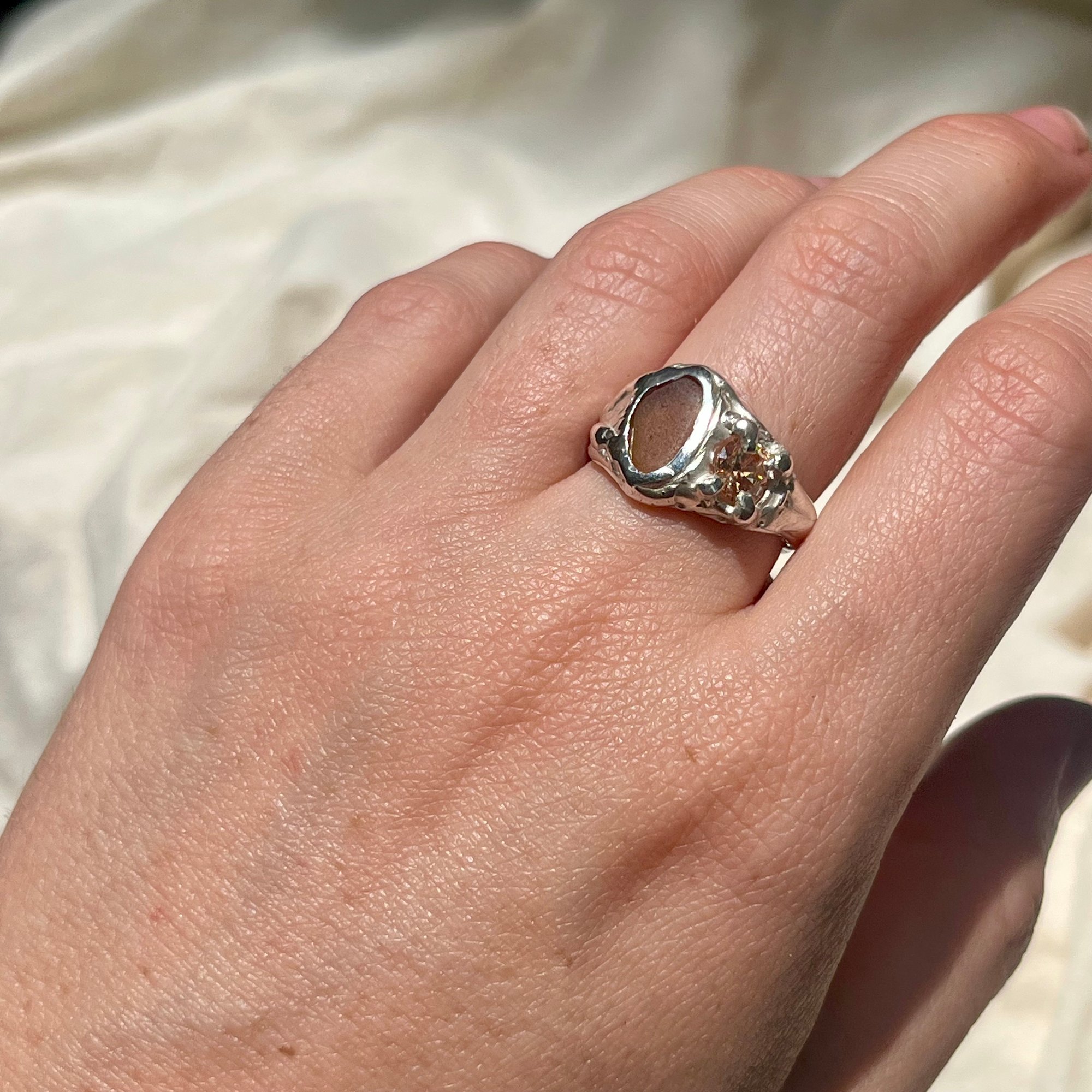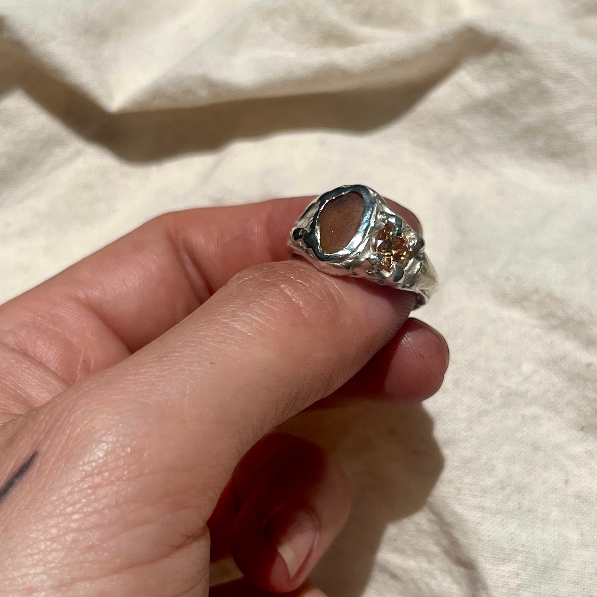 Features genuine sea glass & a cubic zirconia bezel set on a thick textured band