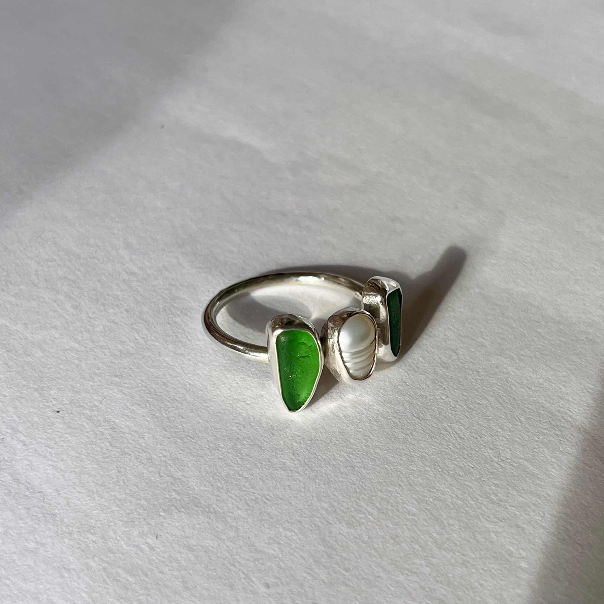 Features a freshwater pearl & handpicked sea glass bezel set on a half-round band
